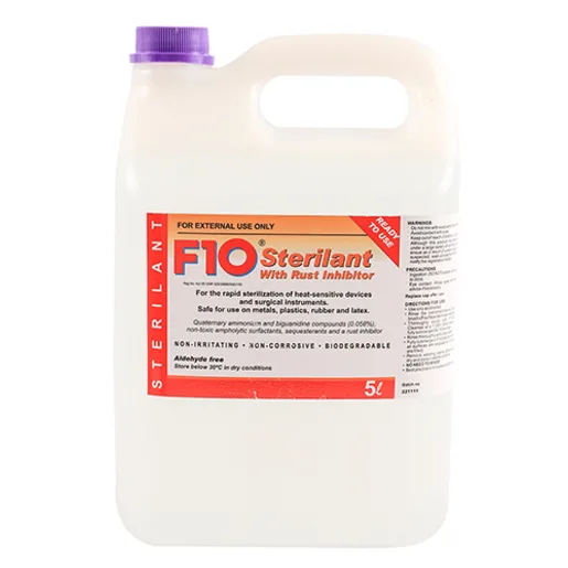 The F10 STERILANT is a high performance, surface acting, biocidal compound derived from the F10 core actives common to the F10 disinfectant product range, for use in the rapid sterilization of heat sensitive devices and surgical instruments. The product can be used for the cold sterilization of stainless steel instruments, flexible and rigid endoscopes, urinary catheters, endotracheal tubes, suture needles, latex drains, clipper blades and sensitive dental, orthopedic and ophthalmology instruments.